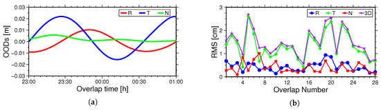(a) is the OODs of the first overlapping arc in the R, T N and 3D directions. (b) is the RMS statistics of the total 28 overlapping arcs in the R, T, N and 3D directions.