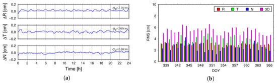 (a) is the differences between the dynamic and reduced-dynamic orbit on 3 December 2016. (b) is the RMS statistics of the differences between the dynamic and reduced-dynamic orbit for DOY 338–366, 2016.