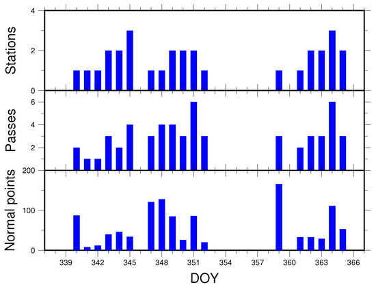 As can be seen from Figure 10, 1118 normal points and 59 observation passes can be obtained in total from 3–31 December 2016, and there are 12 days without observation records. Table 2 presents an example of SLR residuals corresponding to the reduced-dynamic orbit on 6 December 2016.