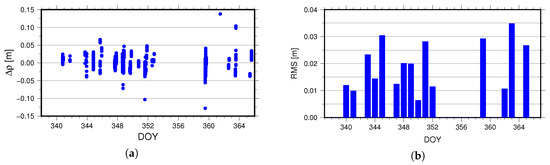 Phase fitting residuals analysis: (a) is the post fitting residuals’ distribution diagram on 3 December 2016. (b) is the RMS values of phase fitting residuals from 3–31 December 2016.