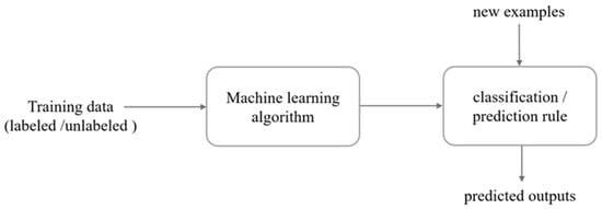 Typically, ML methodologies involves a learning process with the objective to learn from “experience” (training data) to perform a task. Data in ML consists of a set of examples. Usually, an individual example is described by a set of attributes, also known as features or variables. A feature can be nominal (enumeration), binary (i.e., 0 or 1), ordinal (e.g., A+ or B−), or numeric (integer, real number, etc.). The performance of the ML model in a specific task is measured by a performance metric that is improved with experience over time. To calculate the performance of ML models and algorithms, various statistical and mathematical models are used. After the end of the learning process, the trained model can be used to classify, predict, or cluster new examples (testing data) using the experience obtained during the training process. Figure 1 shows a typical ML approach.