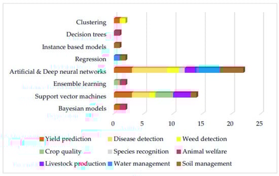 The reviewed articles have been, on a first level, classified in four generic categories; namely, crop management, livestock management, water management, and soil management. The applications of ML in the crop section were divided into sub-categories including yield prediction, disease detection, weed detection crop quality, and species recognition. The applications of ML in the livestock section were divided into two sub-categories; animal welfare and livestock production.