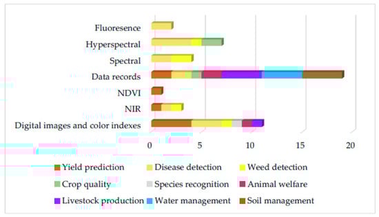 The sub-category of livestock production regards studies developed for the accurate prediction and estimation of farming parameters to optimize the economic efficiency of the production system. This sub-category consists of the presentation of four articles, three with cattle production and one for hens’ eggs production. In the work of [101], a method for the prediction of the rumen fermentation pattern from milk fatty acids was presented. The main aim of the study was to achieve the most accurate prediction of rumen fermentations, which play a significant role for the evaluation of diets for milk production. In addition, this work showed that milk fatty acids have ideal features to predict the molar proportions of volatile fatty acids in the rumen. The next study [102] was related to hen production. Specifically, a method based on SVM model was presented for the early detection and warning of problems in the commercial production of eggs. Based on SVM methods [103], a method for the accurate estimation of bovine weight trajectories over time was presented. The accurate estimation of cattle weights is very important for breeders. The last article of the section [104] deals with the development of a function for the prediction of carcass weight for beef cattle of the Asturiana de los Valles breed based on SVR models and zoometric measurements features. The results show that the presented method can predict carcass weights 150 days prior to the slaughter day. The authors of [105] presented a method based on convolutional neural networks (CNNs) applied in digital images for pig face recognition. The main aim of the research was the identification of animals without the need for radio frequency identification (RFID) tags, which involve a distressing activity for the animal, are limited in their range, and are a time-consuming method.