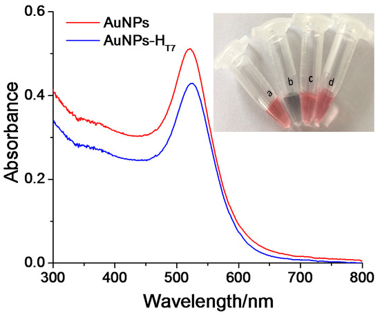 UV–vis spectra of AuNPs and AuNPs-HT7. The inset shows the photographs of (a) AuNPs, (b) AuNPs with 0.15 mol/L NaCl, (c) AuNPs-HT7 and (d) AuNPs-HT7 with 0.15 mol/L NaCl.