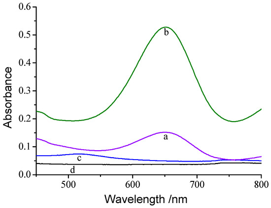 UV–vis spectra of AuNPs-HT7 + TMB-H2O2 reaction solution (a) before and (b) after capturing CH3Hg+ and Hg deposition, (c) AuNPs-HT7 solution and (d) TMB-H2O2 substrate.