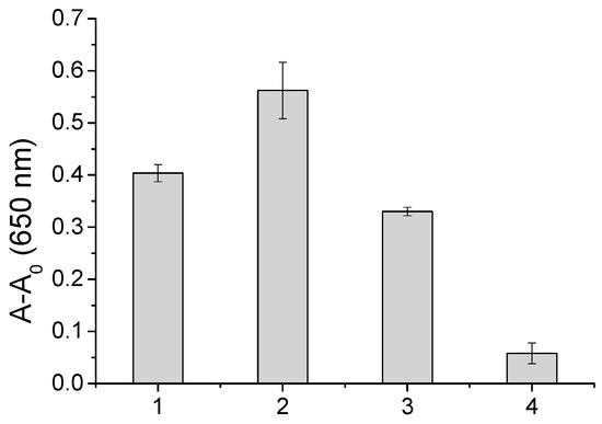 As shown in Figure 2, AuNPs-HT7 demonstrated weak catalytic activity and we only found a weak signal with a peak at 650 nm. After being captured by the HT7 strand, CH3Hg+ species can be deposited onto the surface of AuNPs through Au/Hg amalgamation since they can be reduced to Hg0 by NaBH4 [19,27,28]. In the above process, the catalytic activity of AuNPs-HT7 was obviously increased, which was supported by the appearance of a strong signal at 650 nm. This was due to the oxidation of TMB by the hydroxyl radical that is stabilized on the surface of AuNPs, which produces a blue one-electron oxidation product (i.e., cation free-radical, TMB+) [29]. The reaction is shown in Figure S1. This change in peroxidase-like activity of the AuNPs suggests the deposition of Hg onto the surface of AuNPs [22,25]. The CH3Hg+ sensing mechanism is depicted in Scheme 1.