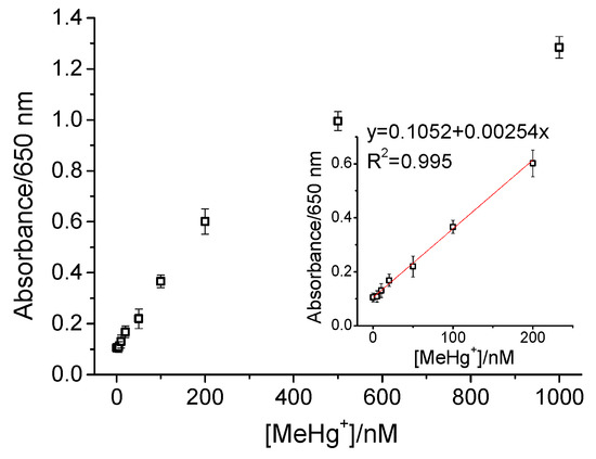 The enhanced peroxidase-like activity of AuNPs caused by CH3Hg+ was further applied in the development of a colorimetric assay for CH3Hg+. As shown in Figure 4, the absorbance increased as the CH3Hg+ concentration increased in the range of 0–1000 nM. A good linear relationship between CH3Hg+ concentration and absorbance values can be obtained in the range of 10–200 nM. The limit of detection (3-fold signal to noise, S/N = 3) was evaluated to be 5.0 nM.