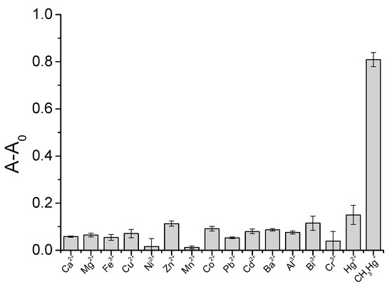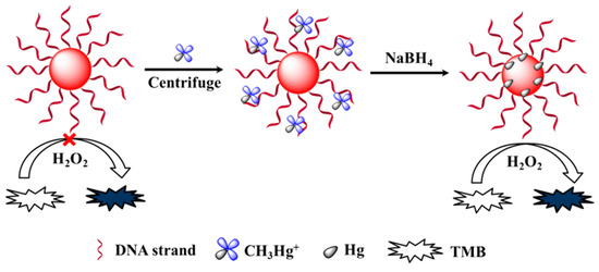 Mercuric ions widely exist in the environment and have distinct toxic effects on human beings. Organic forms of mercury (Hg) demonstrate much higher toxicity than inorganic Hg due to their higher lipophilicity and easier bioaccumulation through the food chain, such as in the tissue of fish [1,2]. The main organic species of mercury, methylmercury (CH3Hg+), has been recognized as a potent neurotoxin that causes damage to the brain and nervous system [1,3]. Due to the severe effects of mercury, the U.S. Environmental Protection Agency has set a maximum level (10 nM, 2 ppb) for mercury species in drinking water [1]. Usually, complex hyphenated techniques, such as high performance liquid chromatography (HPLC) or gas chromatography (GC), coupled to specific detectors, such as mass spectrometry (MS), inductively coupled plasma mass spectrometry (ICP-MS) or atomic fluorescence spectrometry (AFS), are required for methylmercury detection [4,5,6]. However, these techniques generally require expensive instruments and are time-consuming and costly. To overcome the limitation of the above methods, recently, nanomaterial-based assays have been widely used for developing rapid and cost-effective methods for the detection of various heavy metal ions in environmental and biological samples [7,8,9]. Due to the strong metallophilic interactions between Hg2+ and some other metallic atoms, such as gold and silver, numerous metallic nanoparticle-based assays for Hg2+ have been developed [10,11,12,13,14,15,16]. However, there are fewer nanomaterial-based assays for CH3Hg+ compared to Hg2+ ions [17,18,19], which is probably due to the weak interactions between CH3Hg+ and metal nanomaterials.