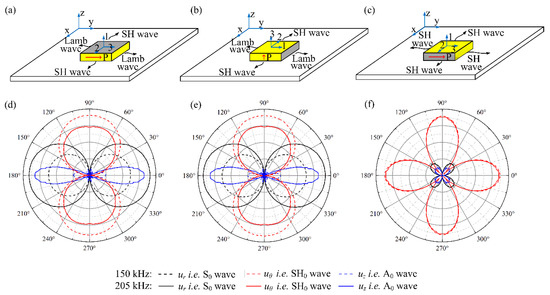 Illustration (up) and simulated results (bottom) of wave radiation patterns generated by using different shear modes piezoelectric wafers at 150 kHz and 205 kHz. (a,d): in-plane poled d15 mode; (b,e): thickness-poled d15 mode; (c,f): face shear d24 mode.