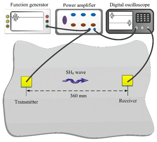 Experiments were then carried out to examine the efficiencies of different shear mode piezoelectric wafers in SH0 wave generation and reception. The experimental setup was shown in Figure 4.
