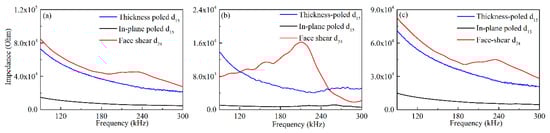 The impedance spectrum of three types shear mode piezoelectric wafers with the same dimensions of 8 mm × 8 mm × 1 mm bonded on the aluminum plate: (a) impedance; (b) resistance; (c) reactance.