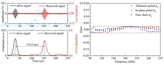 (a) Wave signals generated by the d24 piezoelectric wafer and received by the d36 type PMN-PT wafer with drive voltage of 20 V at 200 kHz; (b) continue wavelet transform (CWT) of the drive signal and receive signal in (a); (c) Frequency dependent relative errors of the measured group velocity of the SH0 waves generated by different shear mode piezoelectric wafers.
