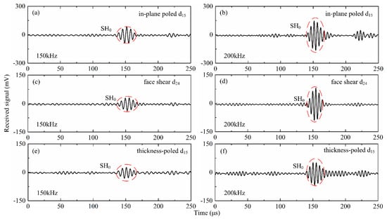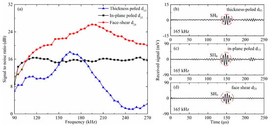 To explain this, the wave signals generated by different types of wafers at 165 kHz were plotted in Figure 11b–d. It can be seen that the SNR for the face shear d24 wafer was maximum and that for the in-plane poled d15 wafer is minimum, which is in agreement with that in Figure 11a. Although the SH0 wave amplitude generated by the thickness-poled d15 wafer was much lower than that by the in-plane d15 wafer, its SNR was still slightly higher because of the much lower noise. It should be noted that the SNR of different types of wafers in SH0 wave generation is almost independent of the drive voltage. From the results in Figure 11, it can be concluded that the face shear d24 wafer was considerably better than the in-plane poled d15 wafer and much better than the thickness-poled d15 wafer in SH0 wave generation and reception.