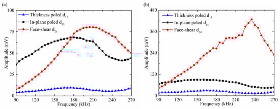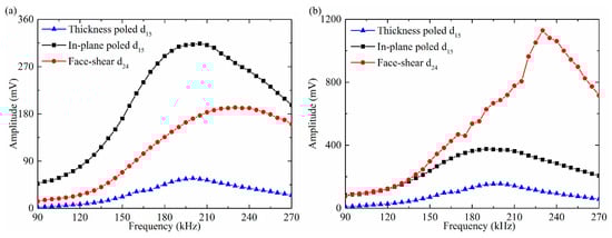 In practical applications, wave signals are usually generated and received by the same type of transducers. Hence it is necessary to test wave signals generated and received by the same shear mode piezoelectric wafers. Figure 10a presented the results with the drive voltage of 20 V. It can be seen that in the whole testing frequency range from 90 kHz to 270 kHz, the SH0 wave amplitude generated and received by the thickness-poled d15 wafer was always the minimum. When the operating frequency was below 175 kHz, the SH0 wave amplitude generated and received by the in-plane poled d15 wafers was larger than that by the face shear d24 wafer. While above 175 kHz, the tendency was totally reversed.