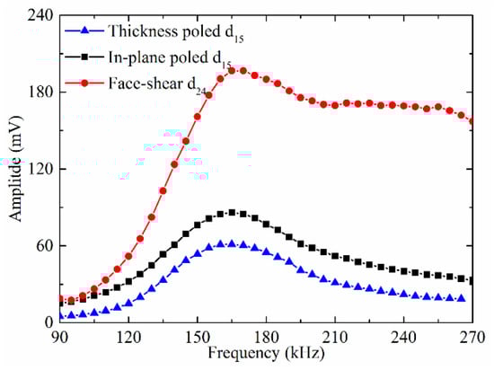 Next the performance of different shear mode piezoelectric wafers in SH0 wave reception was compared. The signals were generated by the d36 type PMN-PT wafer under 20 V and received by different shear mode piezoelectric wafers. The testing results were shown in Figure 9. It can be seen that within the testing frequency from 90 kHz to 270 kHz, the SH0 wave amplitude received by the face shear d24 wafer was always larger than that by the other two wafers. Above 160 kHz, the SH0 wave amplitude received by the face shear d24 wafer was about three times of that received by the in-plane poled d15 wafer and more than four times of that received by the thickness-poled d15 wafer. The excellent reception performance of the face-shear d24 wafer should be attributed to its in-plane shear deformation mechanism which is self-balancing. This result indicated that the face shear d24 wafer was much more suitable to act as an SH wave sensor than both types thickness shear d15 wafers.