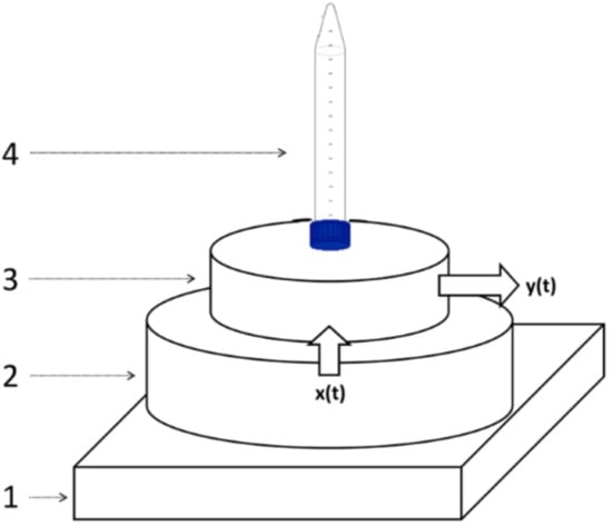 Figure 1 shows the schematic diagram of the experimental setup. The element number 1 represents the polyethylene platform which reduces the influence of the contact support in the acoustic output picked up by the microphone. Box 2 plots the ticking source which generates the input signal x(t) on the resonating cavity. This cavity has a diameter of 15 cm. Box 3 depicts the resonating cavity which includes the piezoelectric microphone that picks up the output y(t). The fluid sample (element 4 in the Figure 1) was placed on the upper surface of the resonator 3. Each audio recording had a duration of 30 s, which was a very good compromise between accuracy, precision and measuring time. This recording time was long enough to eliminate the errors due to the fluctuation of the ticking source from one pulse to another (changes among different spectra from the same sample were below 1%), but short enough to make this technique practical. Obviously, the longer the recording time, the better the spectral precision due to fluctuation averaging.