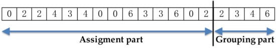 Example of coding a solution for the algorithm for the Grouping Genetic Algorithm (GGA). The assignment part has the length of the set of items to be grouped (14 elements in the example). The grouping part identifies the existing groups (groups 2, 3, 4, and 6 in the example). Each element of the assignment part is related to a single group by storing the group identifier. All the elements related to the same group contain the same group identifier. The value 0 means that the element is not yet associated with any group.