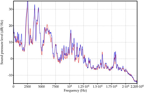 The Figure 5 shows the spectra of two measurements corresponding to samples 2 and 11. The sample 2 is defined with the black line whereas the sample 11 is plotted with red color. The spectra are defined by the sound pressure level (dB/Hz) as a function of the audible frequency range. Both of the curves are very close because their compositions are similar (same concentration of ethanol but different quantity of fructose). Observing the figure, the difficulty to select by hand a set of frequencies as a classification criterion between two different compositions is evident. The selection of a reduced set of frequencies as classifier for the 23 types in Table 1 is much more complex. Similar observation comes from the Figure 6, which compares two spectra of measurements of samples 11 (red line) and 14 (blue line). The spectra are very similar due to both samples have the same quantity of fructose, but different concentration of ethanol. However, the spectra are different besides being very complex to identify a particular sample through only their spectra.