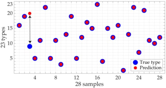 Extreme Learning Machine (ELM) classification of the validation data set in the first iteration of the Table 3. The x-axis corresponds to the measurements of the data set. The y-axis collects the 23 types of samples of the Table 1. Only one measurement is wrongly classified as type 9, whereas the right type is 20, marked with the black double arrow.