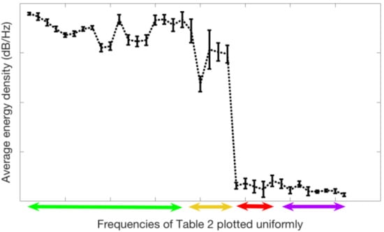 Note that the frequencies are uniformly distributed on the X-axis. The Y-axis represents the average energy density of the spectra of the measurements in our experiments, which range is [−1, 1] dB/Hz. Note the energy density values differ widely for the 36 frequencies. Due to our need to compare similar values between spectral patterns, the frequencies of Table 2 is divided in four subgroups as mentioned before regarding the color code in the table. The Figure 8 is tagged on the X-axis the labels: low, low-medium, high-medium, and high frequencies groups.