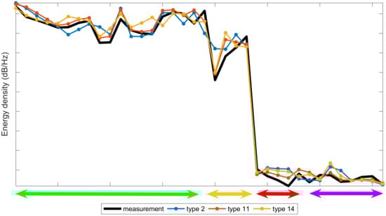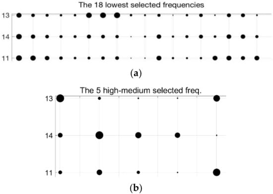 The Figure 14 extracts some information of Figure 9 to make the classification clearer. The figure graphs the 10 medium groups of frequencies because the differences between the bubble sizes of the three types (patterns 2, 11, and 14) are more evident. The bubbles fingerprints of the three ones are in black color and compared to the bubbles line of a particular measurement of type 11 in red color. The comparison of the vertical bubbles lines in both graphs of Figure 14 discard the type 2 as candidate for the classification of the measurement. The bellow graph of the figure lets us correctly classify the measurement thank to the differences of vertical bubbles lines of types 11 and 14. Figure 15a corresponds to the 5 low-medium frequencies group, where the maximum radius is 0.8409 dB/Hz, whereas the minimum radius in the graph is for the 0.0835 dB/Hz. Graph in the right is associated to the 5 high-medium frequencies group. The bubble with the maximum radius is −0.7785 dB/Hz, the minimum radius in the graph is for the −0.9594 dB/Hz.