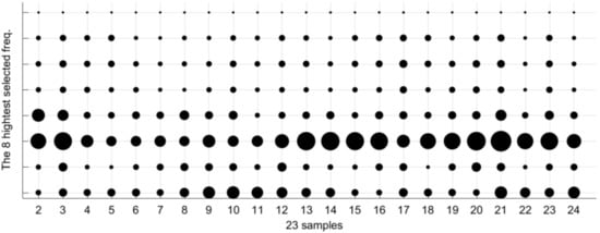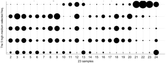 We can appreciate some types with similar but different patterns, for example, the type 2 (0% ethanol and 6 g/L of fructose) and type 3 (0% ethanol and 10 g/L of fructose). The spectral information of the 23 patterns according the other three frequencies subgroups is plotted in Figure 11, Figure 12 and Figure 13. As in the Figure 10, the three of them also present differences between very similar types. Each graph has particular bubble size in order to adjust the biggest bubble radius to the highest energy density value (dB/Hz) in each figure. In the Figure 11 (low-medium frequencies group), the maximum value of the energy density is 0.81514 dB/Hz and the minimum value is 0.061806 dB/Hz. Figure 12 shows the average energy density values of the 23 patterns for the high-medium frequencies are in the interval [−0.63674–0.92144] dB/Hz. The Figure 13 shows the energy density values for the 8 highest frequencies of Table 2 in the value range [−0.69914, 0.96168] dB/Hz.