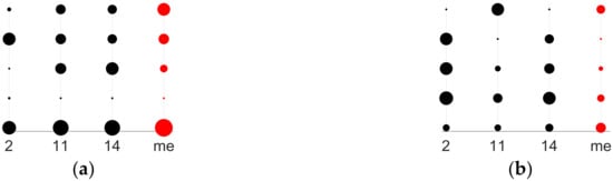 Bubble charts comparing a measurement of type 11 (bubbles of red color) with the patterns of composition more similar (color black for the patterns of types 2, 11, and 14). We included only the low-medium (a) and medium-high (b) frequency groups of Table 2 because the differences are more marked than with the rest of the frequencies. The measurement is correctly classified because it is more similar to the type 11 pattern in these frequencies. With the rest of the patterns, the differences are greater, and those patterns are discarded.