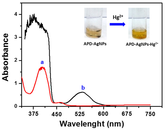 Absorption spectra showing (a) SRP bands of APD-AgNPs and (b) APD-AgNPs-Hg2+ complex. Inset image showing colorimetric digital picture of APD-AgNPs and APD-AgNPs-Hg2+ complex.