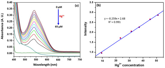 (a) Electronic absorption spectra of APD-AgNPs solutions with various concentrations of Hg2+ in the range of 0 to 65 µM L−1 increasing in steps of 5 µM L−1; (b) Linear relationship between the absorbance intensity of APD-AgNPs versus Hg2+ ion concentration at 538 nm.