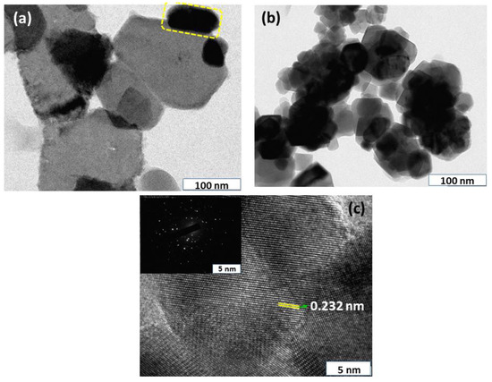 It can be seen from the TEM image of APD-AgNPs that the morphology mainly consists of hexagonal and rod-like particles with an average size of about 18 nm (Figure 4a; using the Image J software, 35 nanoparticles were considered for size calculation). Upon coordination with Hg(II) ions, the polymorphic nature of APD-AgNPs-Hg2+ complex was observed, which mainly has hexagonal, spherical, heptagonal and rod-like nanostructures, revealing the interaction of APD-AgNPs with Hg2+ ions (Figure 4b) and this is also supported by the FT-IR spectrum (Supplementary Figure S1).
