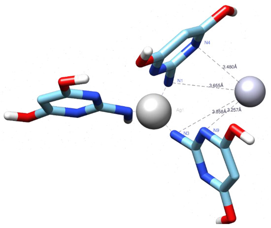 From our molecular docking and interaction studies it was found that Hg2+ has high affinity towards the pyrimidine nitrogen and amino groups of adjacent APD rings linked to AgNPs. It also revealed that the Hg2+ cannot establish a bond with oxygen even though the oxygen atom is electron rich. The inability to form bonds with oxygen is due to the long distance (>6 Å) between the two atoms. It has been well documented that separations between atoms with >4 Å distance results in no bond formation. Thus, it is evident from the molecular interaction and docking studies that the binding of Hg2+ with APD-AgNPs probably occurs according to the predicted mechanism depicted in Figure 5.