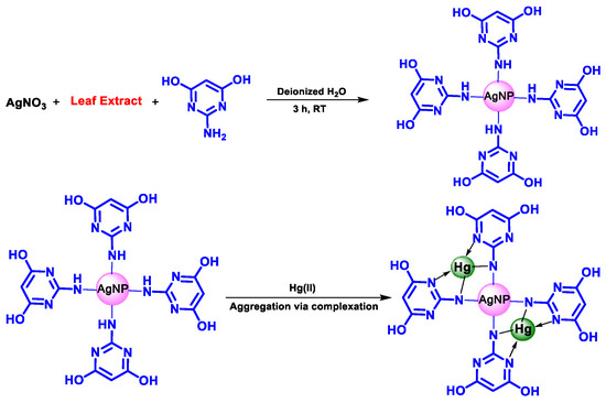 The 2-aminopyrimidine-4,6-diol capped AgNPs (Scheme 1) were characterized and used in a sensor application for Hg2+ detection. The prominent bands observed at 3200, 1650, 1545, 1390, 1180, 1078 cm−1 in the FT-IR spectrum of the APD-AgNPs-Hg2+ complex (Supplementary Material, Figure S1) confirms the presence of phenolic compounds and amine derivatives from the leaf extract and capping agent, used as reducing and stabilizing agents, respectively.