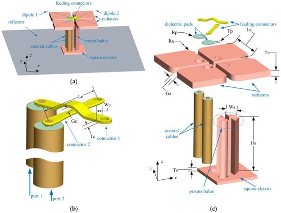 The configuration of the proposed broadband dual-polarized base station antenna is depicted in Figure 1a, where the antenna consists of two pairs of crossed dipoles, two pieces of feeding connectors, two pieces of dielectric pads, a supporter (also a balun) with a height of Hs = 18 mm, and a reflector with a dimension of 80 mm × 80 mm. The proposed antenna is supported by four prisms which are united by a square chassis with a thickness of Ts = 1 mm at the bottom. This supporter also plays the role of balun, whose height is around 0.25λ0 (λ0 is the central wavelength) in this design. Each pair of the dipoles is excited by a coaxial cable that passes through a hole in the reflector and the chassis of the supporter. One arm of a dipole is connected to the outer conductor of the coaxial cable, and the other is connected to the inner conductor of the coaxial cable via a feeding connector. Two pieces of poly tetra fluoroethylene pads with a dielectric constant of εr = 2.2 are installed as separators voiding the contacts between the feeding connectors and the radiators who are connected to the outer conductors of the coaxial cables. The two pads are also used to support the feeding connectors. Detailed feeding configuration and antenna structure are clearly depicted in Figure 1b,c.