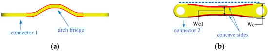 For the two crossed dipoles, the crossed feeding connectors usually result in a difference in the length of current path. In order to gain the same length of current path for the two crossed dipoles, the feeding connectors are carefully designed, as illustrated in Figure 2. Feeding connector 1 is shaped like an arch bridge, which is marked in red in Figure 2a, to cross over feeding connector 2. However, when the current flows through this feeding connector, the length of the current path is increased, compared with a straight feeding structure. This is because the arch structure results in an extra current path. In order to increase the length of the effective current path for the port 2 and offset the extra current length caused by the arch of connector 1, feeding connector 2 is consciously designed with a concave at both sides, as marked in red in Figure 2b. When port 2 is excited, the current flows from one radiator to another radiator via the edges of the connector 2. Accordingly, due to the designed concaves at both sides of connector 2, the current path on connector 2 is altered and an extra length of the current path is thereby obtained. The concave design on the sides of connector 2 can be regarded as a current path compensation. As a result, by tuning the value of Wc1 properly and carefully, both ports can obtain the same length of effective current path. This design also guarantees the symmetry of the current distribution of the dipoles excited by port 1 and port 2.