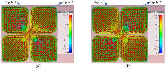 An observation of current distribution is illustrated in Figure 3a,b where the current phase is π/4. It can be found from Figure 3a that the current distribution on the radiators of dipole 2 is highly symmetrical with regard to the axis of dipole 1. A similar current distribution can be seen in Figure 3b. Since the radiators of dipole 1 and dipole 2 are the parasitic elements to each other, when dipole 1 is excited, the current distributed on dipole 2 is the introduced current caused by mutual coupling, and vice versa. The equivalent current illustrations corresponding to Figure 3a,b are presented in Figure 3c,d, respectively. For the excitation of port 1, the current on dipole 1 is equivalent to I1 and the current on dipole 2 introduced by mutual coupling is equivalent to I12; as to the excitation of port 2, the current on dipole 2 is equivalent to I2 and the current on dipole 1 introduced by mutual coupling is equivalent to I21. Since I1 and I12 generate the lower band and higher band resonances for dipole 1, and I2 and I21 generate the lower band and higher band resonances for dipole 2, respectively, the proposed antenna achieves a broad impedance bandwidth. This can be found in the simulated and measured S11 and S22 in Figure 5. Furthermore, it can be found that the directions of the equivalent current corresponding to the excitation of port 1 are perpendicular to the ones corresponding to the excitation of port 2, that is, the directions of I1 and I12 are always orthogonal to those of I2 and I21. As, for a dipole antenna, the direction of linear polarization is same as that of its exciting current, the linear polarizations excited by I1 and I12 are always perpendicular to those excited by I2 and I21. Accordingly, the proposed antenna obtains two orthogonal polarizations under both ports being excited. Moreover, the highly symmetrical distributions of the introduced current ensure that the current flowing between the two parasitic radiators, e.g., radiators of dipole 2 when dipole 1 being excited, is very small. It means that the current flowing between two ports is small enough. As a consequence, high port-to-port isolation is attained by the proposed antenna.