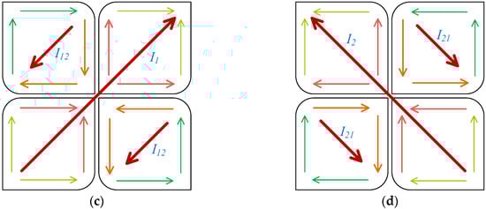 Current distribution excited by (a) port 1 and (b) port 2, and the equivalent current on the radiators corresponding to the excitations of (c) port 1 and (d) port 2 at a phase of π/4.
