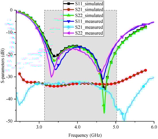 The measured and simulated S-parameters are presented in Figure 5. The results show that the measured S11 and S22 agree with the simulated ones well in general, except for a small frequency shift toward lower frequency. Moreover, although there is a small shift, the measured S11 and S22 still fully cover the required frequency range well, namely S11 < −15 dB and S22 < −15 dB in the frequency range of 3.14–5.04 GHz. In addition, a high agreement in reflection coefficient can be found at two ports. This agreement is mainly benefited from the special design of the two feeding connectors which lead to the same effective length of current path for the two crossed dipoles. Besides, the measured port-to-port isolation, i.e., S21, shows that the proposed antenna can provide a port isolation of at least 32.5 dB over its working frequency band. The high port isolation can be obtained by the proposed antenna, because the introduced current distributed on the two radiators of a dipole is highly symmetrical with regard to the axis of the other dipole, as illustrated in Figure 3. Therefore, the introduced current flowing from one radiator of a dipole towards another radiator is very small, when the other dipole is excited. In other words, the introduced current in port 1 is very small when port 2 is excited, and vice versa. This kind of balance can be guaranteed by the well-designed balun structure and feeding connectors.
