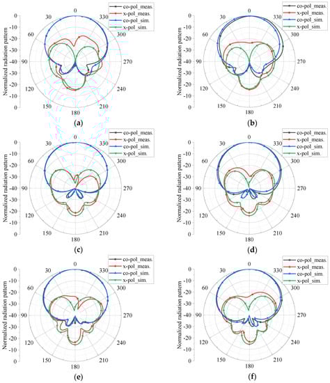 The measured and simulated normalized radiation patterns in horizontal plane (H-plane) and vertical plane (V-plane), namely xz-plane and yz-plane shown in Figure 1, for the excitation of port 1 at 3.3 GHz, 4.15 GHz, and 5.0 GHz are plotted in Figure 6, where “co-pol” and “x-pol” in the labels represent the co-polarization and cross-polarization and the suffixes, “meas.” and “sim.”, stand for the measured and simulated results, respectively. It can be seen that the co-polarization components of the measured normalized radiation patterns are highly consistent with the simulated ones for all observation frequencies. Though there are some differences between the cross-polarization components of the measured and simulated radiation patterns, the measured results are on the whole coincident with the simulated ones. In addition, the results suggest that high agreements in radiation patterns in H-plane and V-plane are obtained across its operating band.