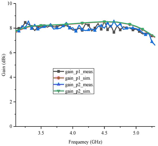 Figure 7 presents the measured and simulated gains of the proposed antenna. Though the measured gains are a little lower than the simulated ones, and the measured results suffer a very small fluctuation, around ±0.3 dB, the measured results are on the whole coincident with the simulated ones for the excitations at both ports, obtaining gains of around 8 dBi. It suggests that the proposed antenna can provide stable gains over the working band.