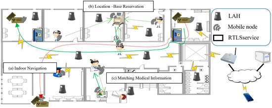 This is a preliminary study of our research team before this study, and the LAH developed here is used in this study, so it is mentioned here to help the reader’s understanding. The LAH is an indoor location-based service hub with an overlay network. It is autonomously serviced without direct manipulation [13,14,15], and it recognizes the surrounding environment, providing services via autonomous collaboration among hubs without a central server. For example, in Figure 1b, the doctor requests location-based services, such as finding or scheduling a hospital equipment near the current location. The user is then provided with optimal service via the cooperation of hubs at each indoor space. The LAH has two roles in the RTLS application, the first is the role act as a location anchor for each mobile asset, and the second is the wireless communication access point in each unit space.