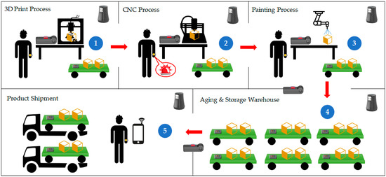 Due to the advance of technology, many industrial factories are becoming automated in various ways. Current factory automation techniques mainly use centralized control-based production automation systems (i.e., Industry 3.0). However, future factories (i.e., Industry 4.0) will be equipped with real-time communication technologies that are attached to products moving throughout the factory [1,2]. It will also provide devices for workers to wear as well as providing a smarter environment for manufacturing facilities [3,4,5,6]. Currently, these smart factory technologies focus on automating and integrating production processes rather than device collaboration, and they do not suggest a model that connects products, workers, and manufacturing equipment together [7,8].