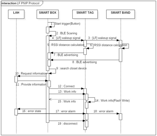 This is additional preliminary study of our research team before his study, and the PNIP is used in this study, so it is mentioned here to help the reader’s understanding. Proximity-based neighbor identification protocol (PNIP) is a hardware-based wakeup method that includes a software-based device-to-device (D2D) communication protocol for opportunistic services [16]. Figure 2a shows the PNIP wakeup service and Figure 2b shows the communication process of PNIP service with sequence diagram. The most important functions of PNIP are wirelessly waking the system from sleep mode and using low frequency (LF) (100–130 kHz) communications with high reliability. Such a wireless wakeup system using LF communication is also used in a vehicle smart key system [17]. When compared to the high frequency 2.4-GHz band, LF behaves better with obstacles, such as human bodies. The LF module generates and transmits a preamble to neighboring devices. One or more of those devices successfully receives the preamble and interrupts the main microcontroller unit (MCU). By utilizing an LF receiver chip that receives a predefined preamble, a wearable device awakens and exchanges data. Therefore, wearable devices can remain in sleep mode and facilitate ultralow power consumption [18]. Additionally, the response packet of the wearable device includes the identity and received signal strength (RSS) indicator (RSSI) value of the LF source device, enabling the accurate determination of distances between the LF source device and the wearable device. In this paper, we use PNIP to communicate between smart box and mobile devices.