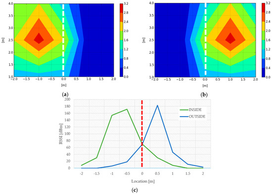 We also measured the RSSI based on the LF transmitters of the smart box and visualized it to determine the difference in LF RSSI between the inside and outside of the door. Figure 11a shows the signal strength of the inner LF transmitter, Figure 11b shows the signal strength of the outer LF transmitter, and Figure 11c shows the change of the LF RSSI value of the two transmitters according to the variation of the X-axis distance with the Y-axis of Figure 11a,b fixed at 2.5 m. It can be confirmed that the inside and outside are clearly distinguished based on the portion that is near the zero meter (door). Therefore, this allowed for us to monitor mobile assets entering and leaving a 4-meter range of doorway with a pair of LF transmitters. As shown in Figure 11, it can be confirmed that the accuracy of distance recognition by LF-based RSSI guarantees the cm level.