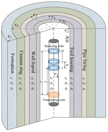 Consider a uniform linear multi-coil array-based borehole TEM system equipped with a single transmitter and M receivers with an inter-element spacing of Δz and TRDs ranging from z1 to zM, which are comprised of coaxial coils wound around a soft magnetic core in a cylindrically layered medium. The multi-cylindrically layered structures of the borehole TEM system including the electrical and geometrical parameters of the jth layer (μj, εj, σj, and rj with j = 1,2,…,J) are illustrated in Figure 1. We consider the magnetic core to be the innermost layer. The transmitter and the M receivers are located in the second layer, with their number of turns given by NT and NR, respectively, where each receiver has the same number of turns. In this paper, M receivers are utilized instead of the traditional single receiver [13,14,15,16,17] with the same total number of receiving coil turns of MNR. Thereby, with a large value of M, NR, as well as NT, can be small enough to ensure that the change in the TRD for each single receiver can be ignored and treated approximately as a single value. It is assumed that the diameters of all the coils are sufficiently small so that the source region contains only the second layer, and the induced electromagnetic force (EMF) of the receiving coils is only related to the vertical component of the magnetic field of the first layer (the magnetic core). Moreover, all of the other layers, such as the liquid mud, casing, and formation, are regarded as source-free regions. In addition, to measure the thickness of the metal pipes, we assume that the electrical parameters of all the layers and the inner radius of the metal pipes are fixed.