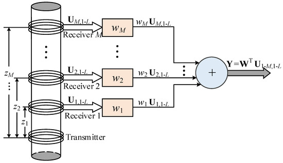 In Section 3, it was illustrated that X(z) is only related to the TRD for a uniform linear multi-coil array, and acts similarly to an array manifold in a phased-array radar. Therefore, we can apply a weight to the received signal to eliminate the influence of the TRD by cancelling out the array manifold X(z). Under this configuration, we employ the principle of the LCMV criterion to weight the array signals in Equation (21), where a receiving weight vector W∈RM×1 is applied to optimize the array data.