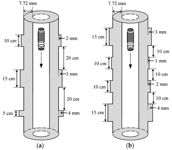 The validity of the uniform linear multi-coil array-based borehole TEM system for downhole casing inspections was confirmed using field experiments. The experiments were conducted in standardized 51/2-inch (with thicknesses of 7.72 mm and outer diameters of 139.7 mm) metal casings. In our experiments, two metal casings with different structures with thickness changes, including increases in the thickness from 1 mm to 4 mm corresponding to lengths from 5 cm to 15 cm in the longitudinal direction, respectively, as shown in Figure 3, were designed and analyzed to illustrate the effectiveness of the proposed method.