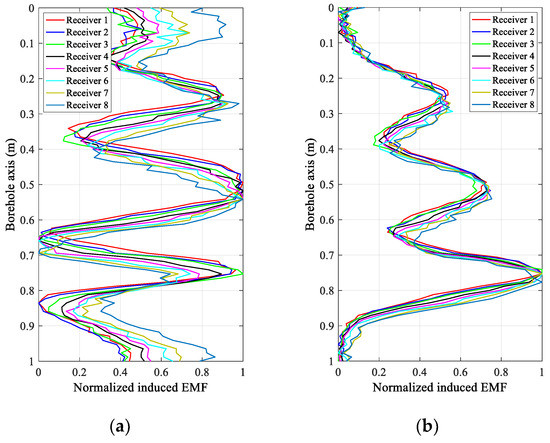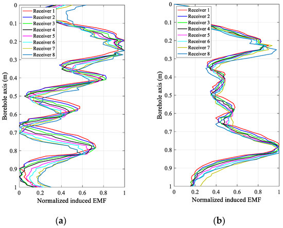Figure 4 and Figure 5 show the experimental results of the eight receivers of the uniform linear multi-coil array at an early time of 20 ms and a late time of 40 ms in the inspection of the experimental casing structures in Figure 3a,b, respectively. In Figure 4 and Figure 5, the received signals of each receiver are normalized to make them clearer and easier to distinguish and compare. Regardless of the decrease in the SNR with increasing TRD, we can still see that the induced EMFs of the eight receivers at the same sampling time have similar shapes, excepting a longitudinal (borehole axis) shift, which is primarily caused by the different TRDs of the different receivers, and performs just like a “phase shift” in a phased-array radar. Obviously, if the receiving data of the eight receivers are directly summed (the arithmetic mean), the resolution of the casing inspection will be substantially decreased due to the shift in the receiving data along the borehole axis with respect to the different TRDs. However, comparing the early and late time data in Figure 4 and Figure 5, we find that, even though the early time data of the TEM system have better resolution than the late time data [16], the shifting also appears more seriously, which means that the size of this type of shifting is related not only to the TRDs and the inter-element spacing but also to the eddy-current diffusion range. Therefore, it will be difficult to compensate for the shifting via an ordinary curve alignment for all the diffusion times (sampling times). Using the numerical approach in Section 3, the proposed LCMV-based array processing is only related to the TRDs and will not be affected by the sampling time and casing thickness, therefore making the compensation more effective and efficient.
