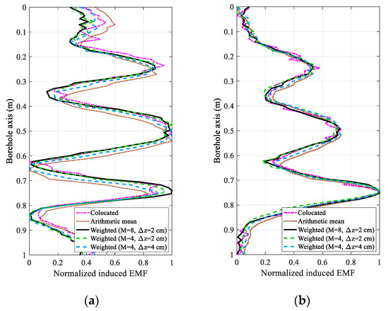 where iω = sln2/t and t and Ds denote the observation time and the integral coefficient of the Gaver–Stehfest inverse Laplace transform, respectively. We can see that the induced EMF of the borehole TEM system is related not only to the observation time and the thickness of the downhole casing, but also to the TRD of the mth receiver. In other words, the three variables in Equation (7) are coupled together in the TEM response. Of these three variables, it is the coupling between t and d, also known as the eddy-current diffusion or the time-domain property, that offers several benefits to the TEM system to achieve better performance [16,25]. Conversely, when a single receiver with a large number of turns or a multi-coil array is used, the TRD will strongly influence the interpretation of the NDE, where the change in the TRD cannot be ignored and must be compensated for to avoid model distortions in the borehole TEM system.