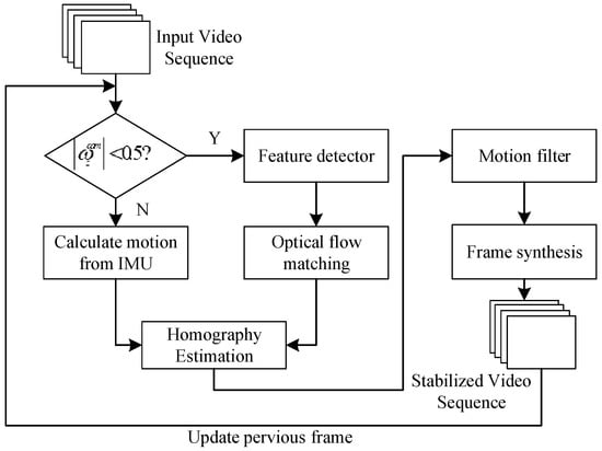 The common technique for motion estimation in digital video stabilization is using block matching [], a KLT (Kanade–Lucus–Tomasi) tracker [,], SIFT [] and SURF [], respectively. Some of the feature trackers such as SIFT and SURF have a heavy computational load for real-time digital video stabilization []. However, recently, Dong et al. [] and Lim et al. [] performed a KLT tracker to estimate the motion in real-time with a high frame rate and a low computational cost. A KLT tracker detected the feature points by Good Feature to Track and estimated the optical flow of consecutive frames with the Lucas–Kanade method. This tracker features success in evaluating the motion in the small movement but fails when exposed to a significant change in both local motion and global motion []. However, the large motion can be approximated by using IMU (Inertial Measurement Units) data as shown in [] that demonstrates the efficiency of the gyroscope in estimating the optical flow during fast rotation. It adopted only the gyroscope data to aid the optical flow computation in improving the performance while measuring the motion estimations.