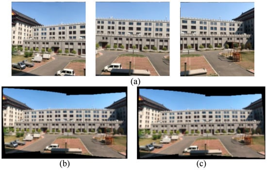 However, to run the algorithm in real-time, the feature points and their matching paired two consecutive frames essential during the computation time. We experimented the stitching panorama to confirm the efficiency of a certain number of feature points, which was sufficient to the homography matrix. Figure 2a shows the original of the images before stitching, Figure 2b,c illustrates the panorama images using 200 feature points and 2000 feature points, respectively. Those images were similar, but the large feature points overly computed the stitching image. Thus, our proposed method used less than 200 feature points to allow a reasonable estimate of the motion transformation.